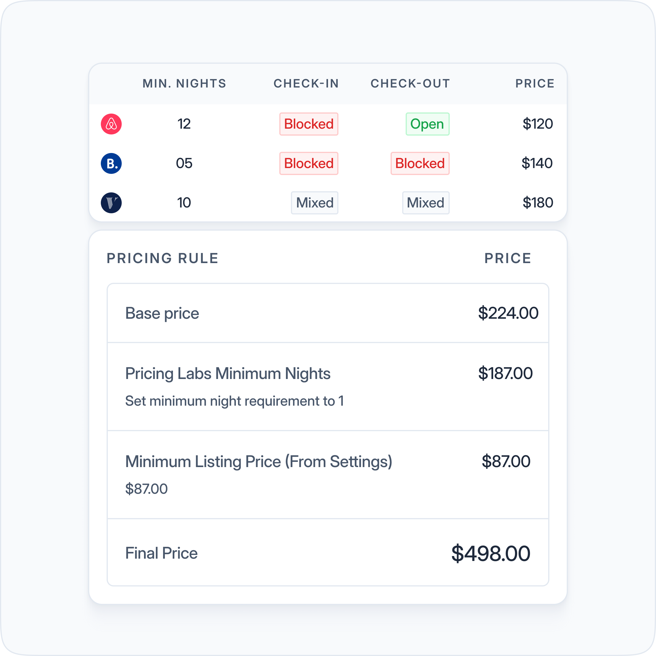 - Set minimum/maximum nights, block check-ins/out, or create custom rules for different channels.